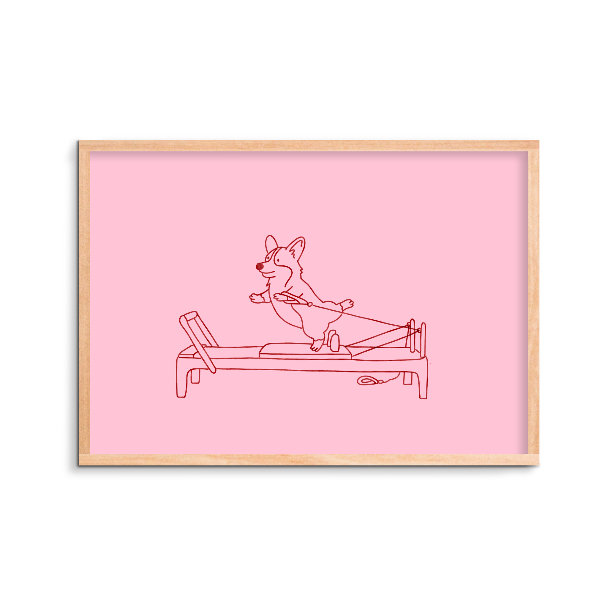 Who knew four short legs could handle a reformer with such grace? This bold red line-art print on a soft petal-pink background showcases a Corgi getting in a serious Pilates workout. It’s a humorous and stylish tribute to staying active and dedicated to your fitness goals. This print is a fantastic motivator for a home gym or a thoughtful gift for the Pilates enthusiast in your life.