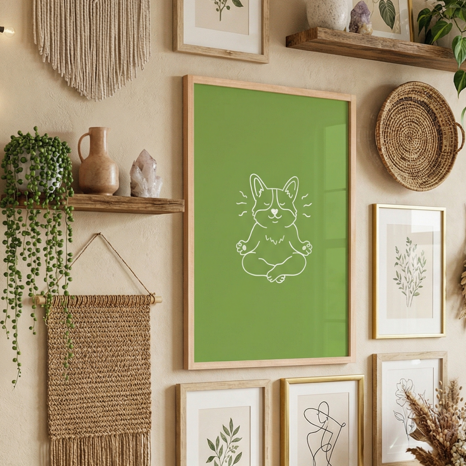 Find your center with the ultimate master of mindfulness. This print features a serene Corgi in a perfect meditative pose, rendered in white marker lines against a calming sage green background. Whether you're setting up a dedicated yoga corner or just need a gentle reminder to breathe during a busy workday, this "Zen Master" brings a sense of peace and a touch of humor to any room